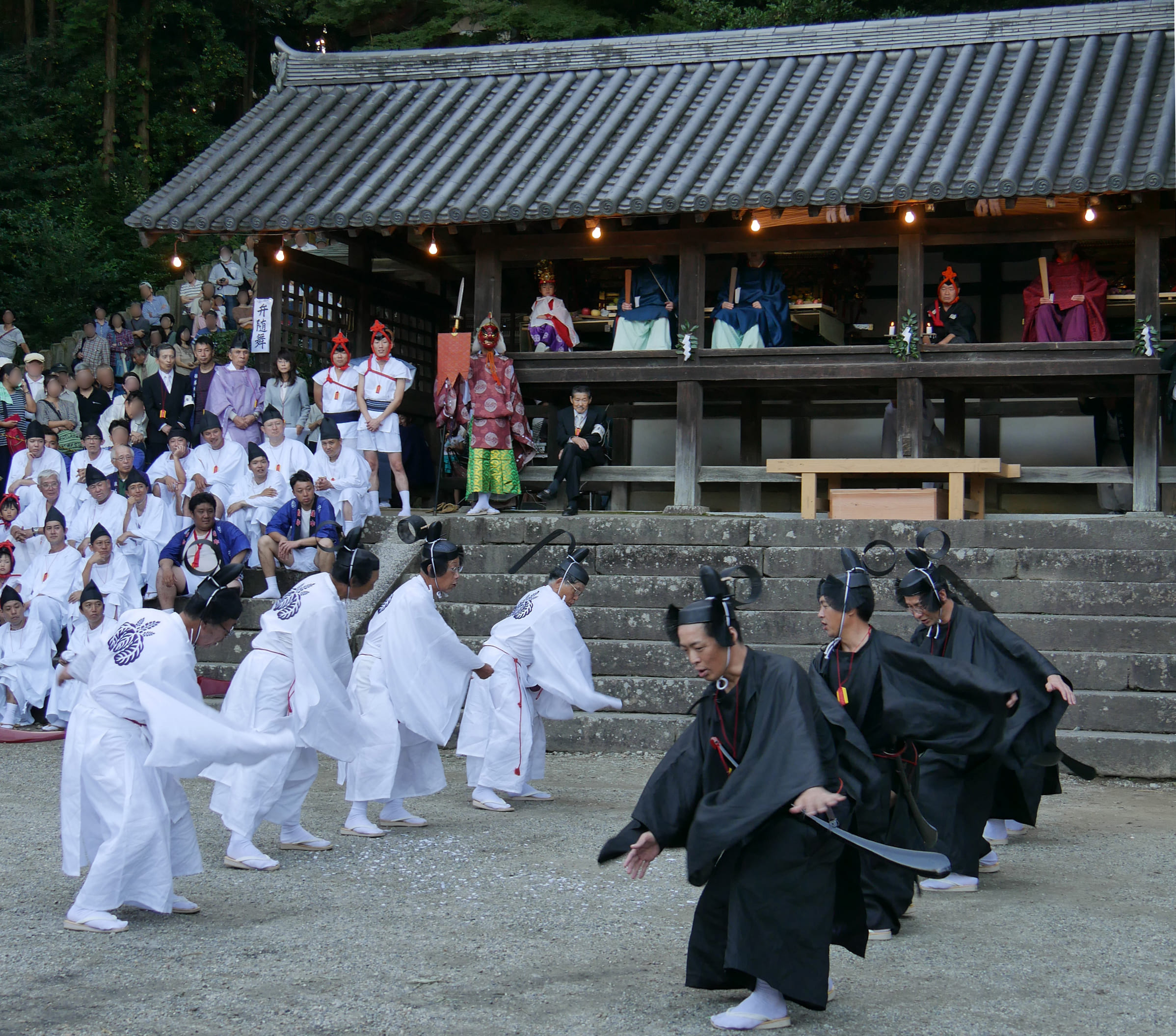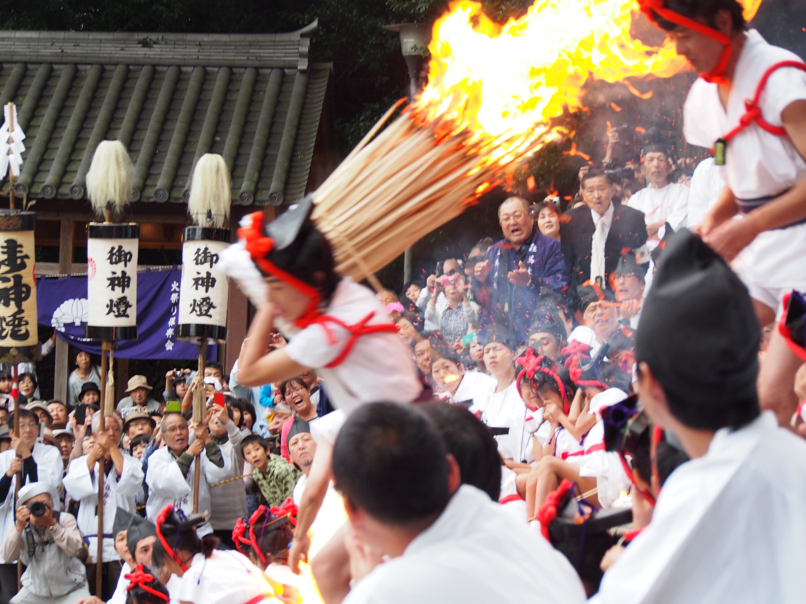 境内の緊張が最高潮になった16時ごろ、御旅所の中がぱっと明るくなったかと思うと、燃えさかる松明を両肩に乗せて歯を食いしばる「火出し」役の男性が、「火取り」と呼ばれる2人に松明を渡します。その瞬間、2人は競って石段を駆け下り、北と南に分かれて境内の外へと走り去ります。参拝者たちが一瞬の出来事に圧倒されている間に、審判役の「弁随(べんずり)さん」が勝者側の弓矢を倒して神事は終了します。石段はたったの7段。本当にあっという間の最後です。