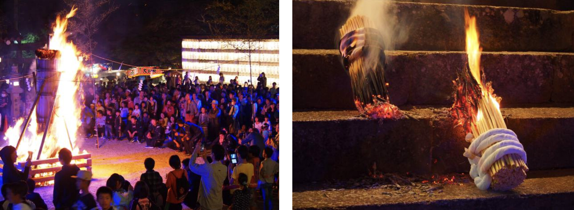 宵宮祭に集う人たち / 古式にのっとり上下に置かれる「宵宮火」