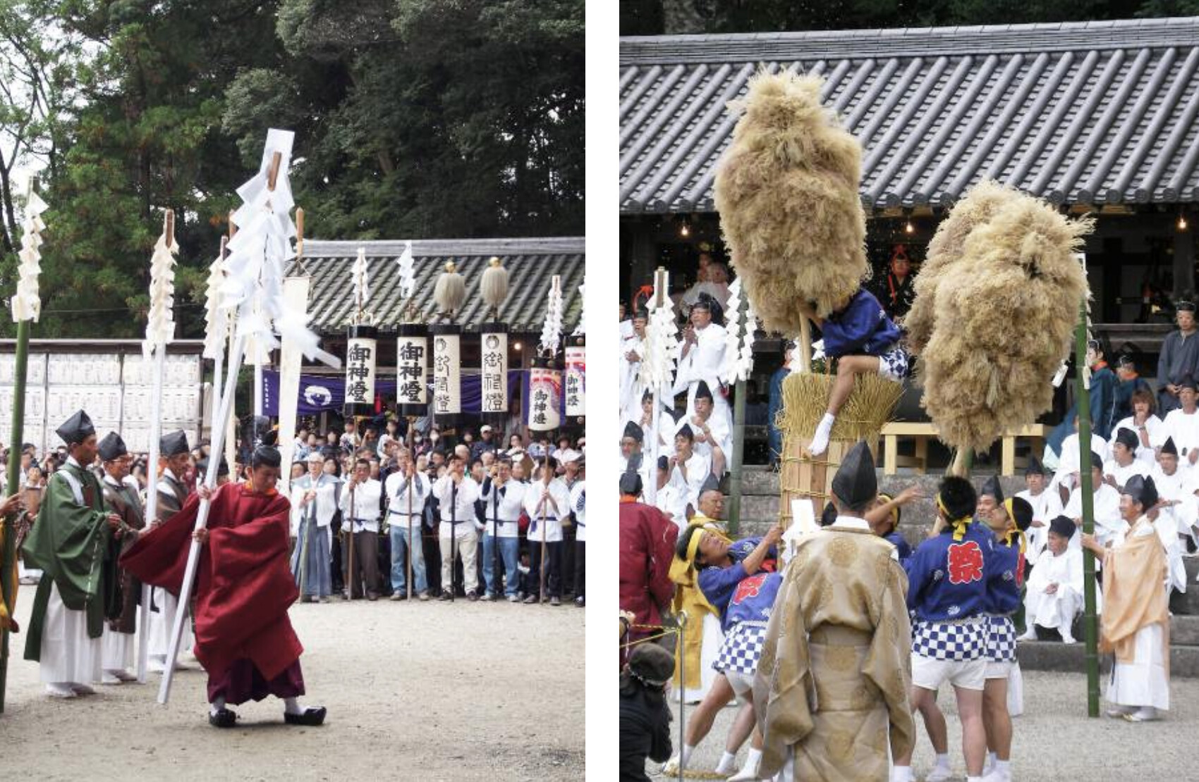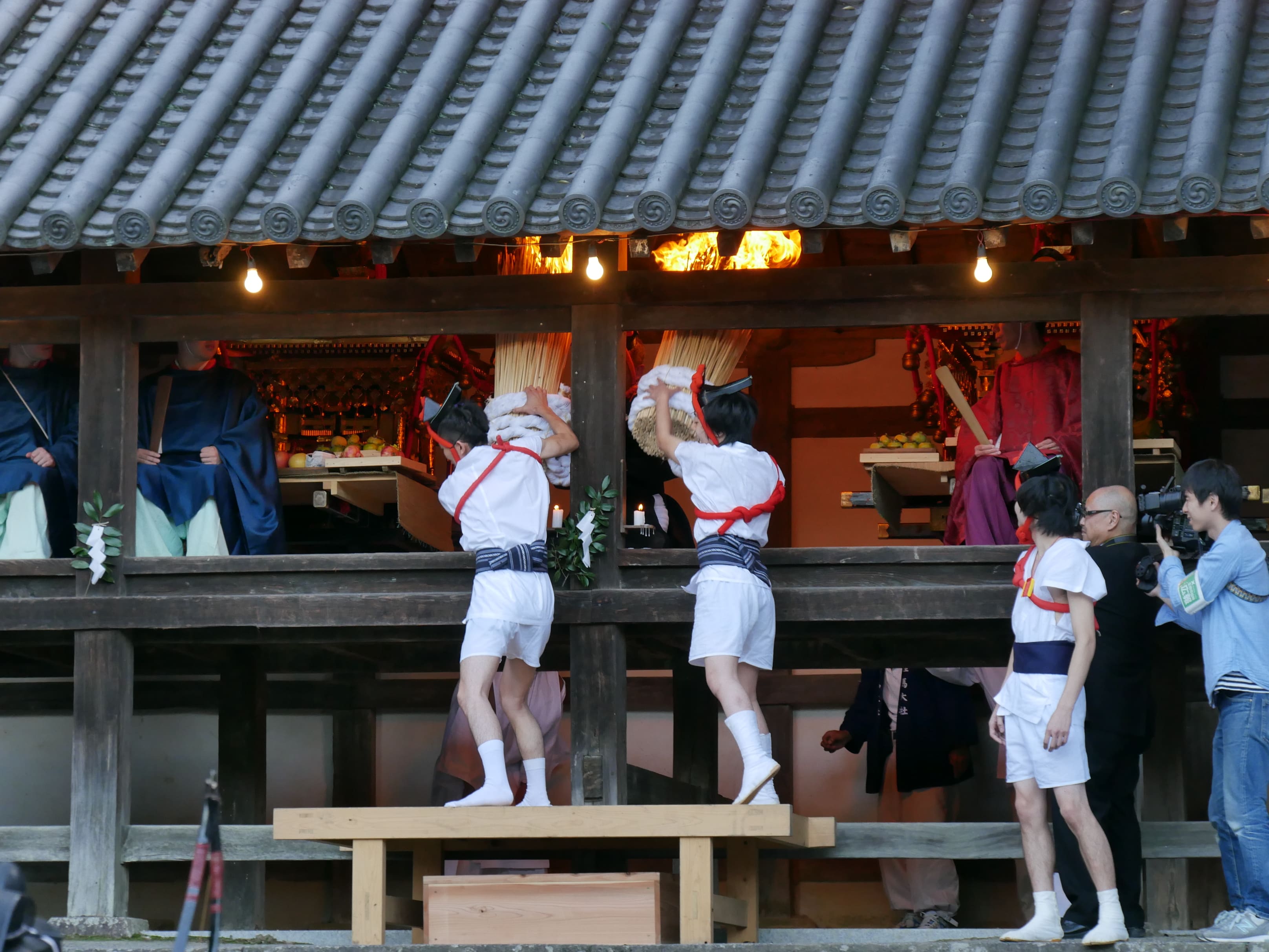 御旅所に神さまが到着すると、すぐに北座と南座に分かれて「神饌(しんせん)」と呼ばれる食べものをリレーで運んで競う「御供(ごく)上げ」が始まります。次に、宮司が背丈の倍ほどもある大きな幣(ぬさ)をたてまつる「奉幣(ほうへい)」、串をつけたススキの穂を大松明の上によじのぼって立てる「おはな立て」など、珍しい行事が続きます。
