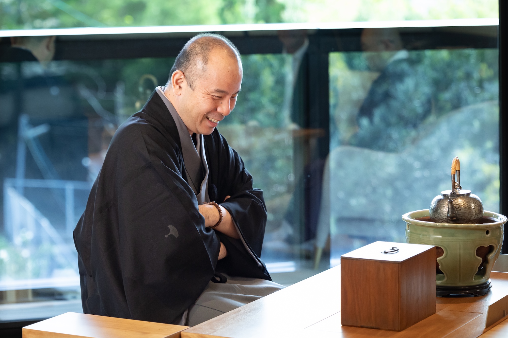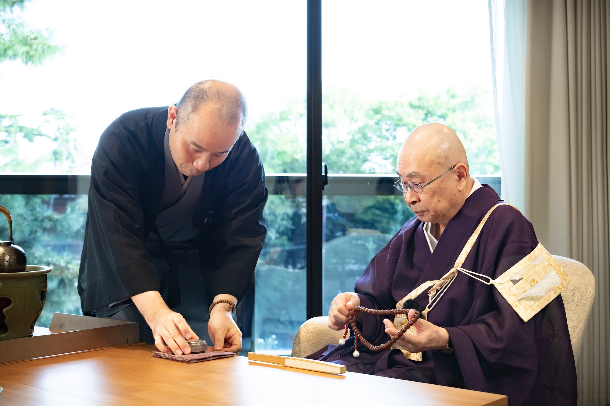 2025年の晩夏、国宝 北円堂を間近に臨むスイートルームに、興福寺前貫首の多川俊映寺務老院をお迎えし、武者小路千家第15代家元後嗣の千宗屋さんによる特別茶会が行われました。2018年には300年ぶりの中金堂再建落慶法要で、5日間にわたり献茶をなさった宗屋さん。旧知のお二人による、和やかで知的な茶会の一端をお届けします。