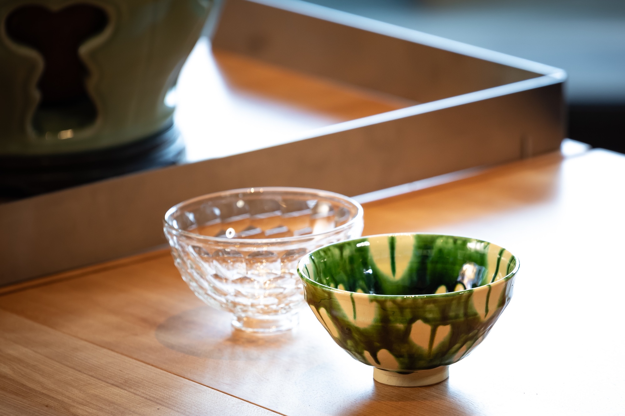 もう一つは、奈良のガラス作家、津田清和さんの白瑠璃碗です。正倉院に白瑠璃碗というカットガラスが伝わっていて、ササン朝ペルシャから日本にわたり、聖武天皇の傍らにあった御物です。いずれも天平時代に実際使われていた器のデザインを元に茶道具に翻案しました。