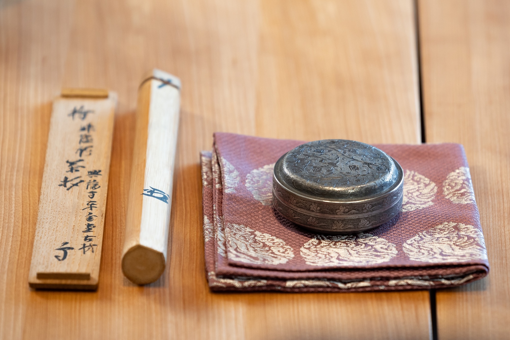 棗(なつめ)は法隆寺の古材で、愈好斎(ゆうこさい:武者小路千家第12代 千聴松、1889〜1953)の好みでできているものだそうです。茶箱の寸法にも合います。茶杓は東金堂の古材、愈好斎が昭和15年にお献茶をした際に頂いたものではないかと。